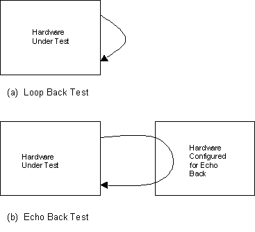 The main disadvantage of the Loop Back Test was that it does not test out the hardware logic at the transmitter and receiver interfaces. This problem can be solved by performing the Echo Back Test. Here the interfacing card is configured in echo back mode, i.e. the interfacing receives the data and echoes it back by transmitting it to the card under test. Thus the card under test receives back the data that it had transmitted. The important difference from the loop back mode is that this is now testing the transmit and receive driver logic. The picture shown below points out this difference between loop back and echo back.